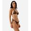 Biquíni calcinha feminino confeccionado em malha de poliamida com proteção UV e estampa animal print. A peça tem modelagem fio dental, com caimento ajustado, laterais finas com ajuste por amarração e menor cobertura posterior.