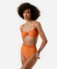 Biquíni calcinha confeccionado em malha com proteção UV. A peça tem modelagem hot pant, com caimento ajustado ao corpo, laterais largas e maior cobertura na parte posterior. Possui tira trançada aplicada no cós.