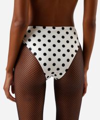 Biquíni calcinha de carnaval feminino confeccionado em malha de poliamida com proteção UV e estampa poá. A peça tem modelagem hot pant, com caimento ajustado, cintura alta, laterais largas e maior cobertura posterior.