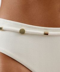 Biquíni calcinha confeccionado em malha com proteção UV e textura chevron. A peça tem modelagem hot pant, com caimento ajustado ao corpo, laterais largas e maior cobertura na parte posterior. Possui tira fina com miçangas metalizadas.