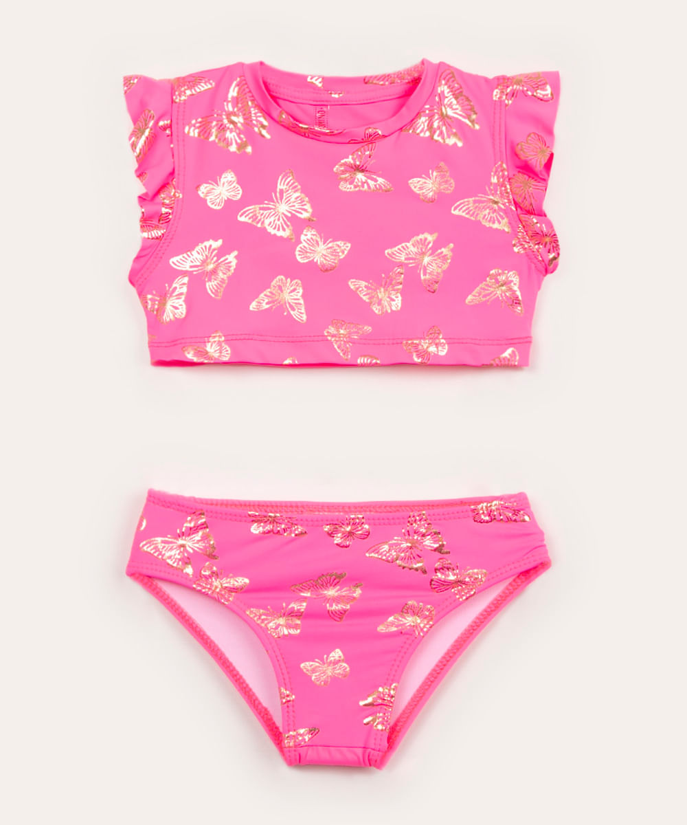 Biquíni confeccionado em malha de poliamida com proteção uv50+. A blusa possui decote redondo, mangas de babados, estampa de borboletas com efeito metalizado em foil, caimento ajustado ao corpo e acabamento elástico. Calcinha possui acabamento elástico.