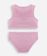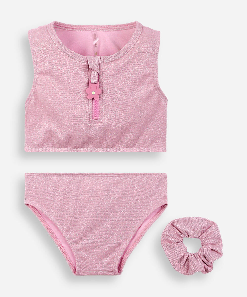 biquíni infantil com lurex e elástico para cabelo rosa