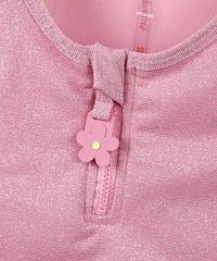 Biquíni infantil confeccionado em malha de poliamida texturizada com elasticidade, toque leve e macio. O modelo é composto por top e calcinha. O top possui modelagem alongada, decote redondo com zíper que facilita na hora de vestir a criança, alças largas, detalhe de floral no puxador e barra com elástico embutido que proporciona maior conforto durante o uso. A calcinha com modelagem biquíni, cós com elástico embutido e laterais largas. Ambas as peças possuem fios de lurex causando um efeito brilhoso, forro e acabamento pespontado. Acompanha elástico de cabelo estilo scrunchie.