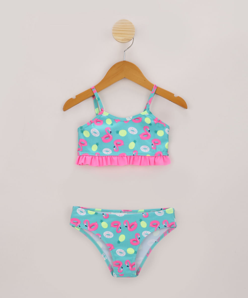 Biquíni infantil desenvolvido em malha com proteção UV50+. O conjunto é estampado com flamingos. As alças são finas e cruzadas. A barra tem acabamento em babado em cor contrastante. A calcinha tem laterais e parte posterior grandes. Possui forro em malha.