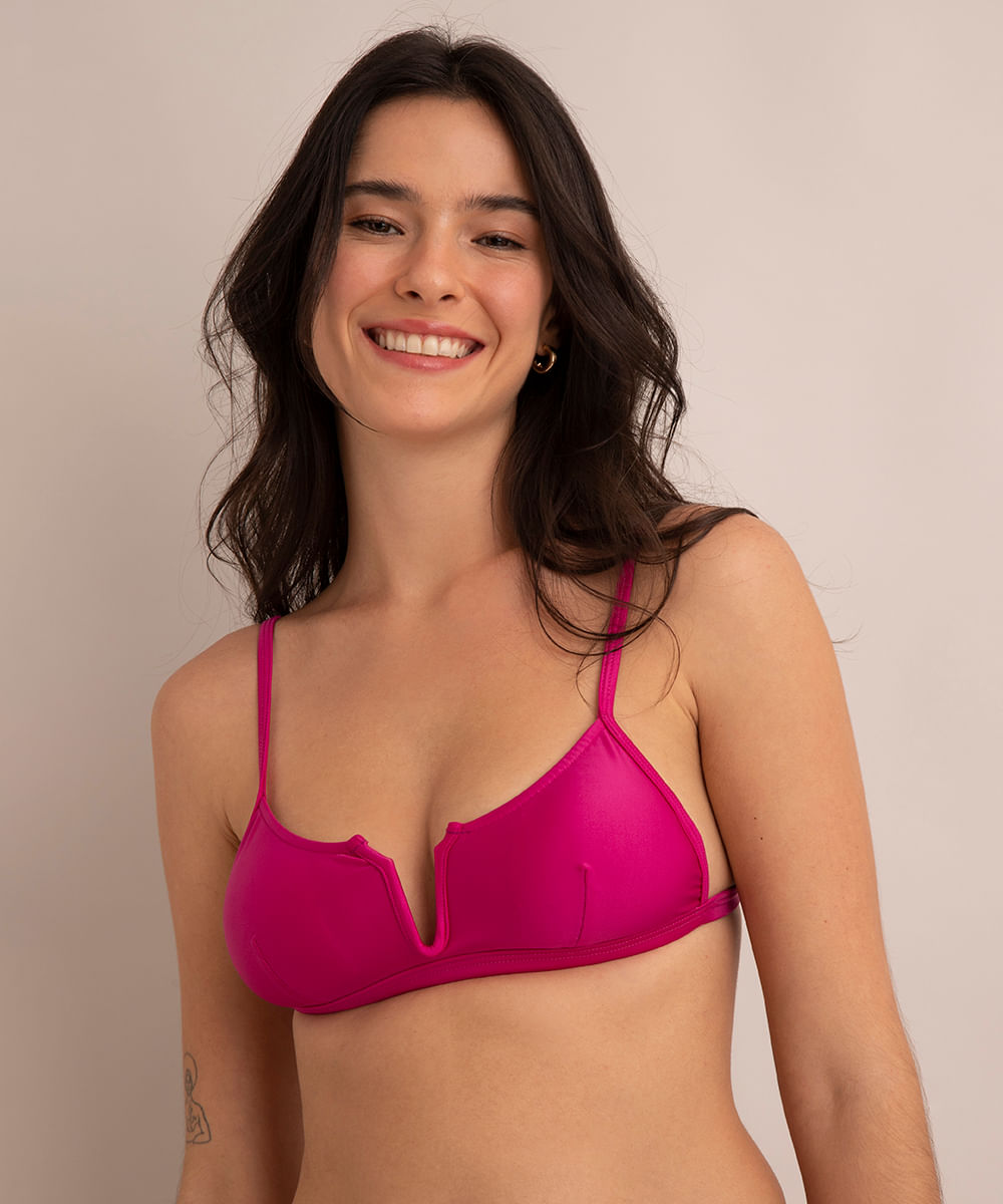 Biquíni top feminino desenvolvido em malha com proteção uv50+. A peça tem modelagem ajustada ao corpo. Tem decote em V e alças finas com regulagem. Possui forro e bojo. O fechamento é por amarração.