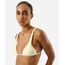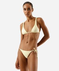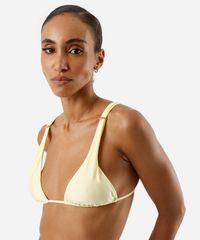 Biquíni top feminino confeccionado em malha de poliamida com proteção UV. O modelo é cortininha, com caimento ajustado, tira fina regulável na base, bojos removíveis e alças médias com aviamento decorativo. O fechamento é na parte posterior por amarração.