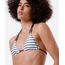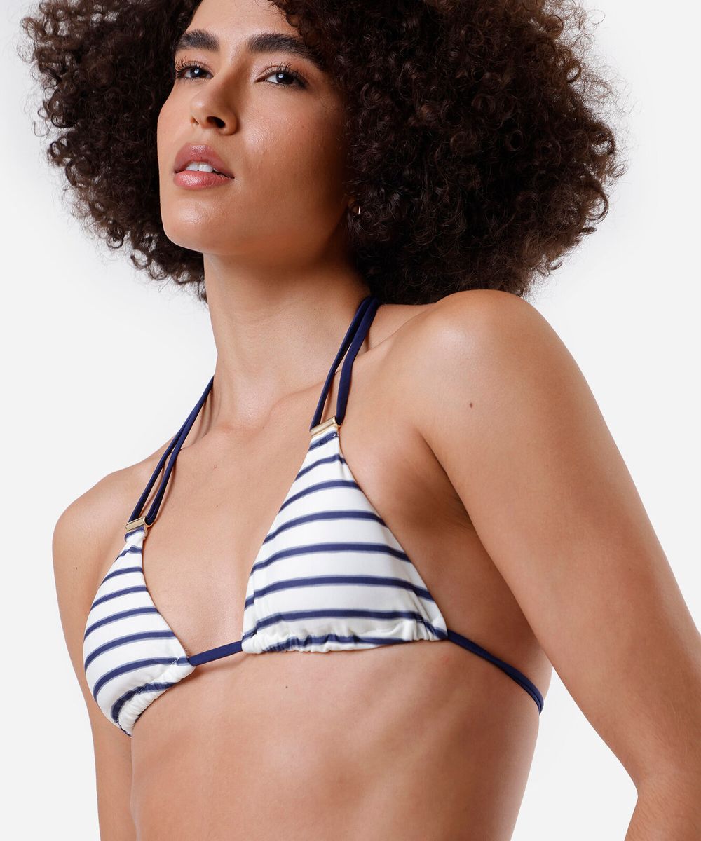 Biquíni top feminino confeccionado em malha de poliamida com proteção UV e estampa listrada. O modelo é cortininha, com caimento ajustado, tira fina na base ajustável, bojos removíveis, alças finas duplas com aviamentos e fechamento por amarração posterior . Possui forro em malha.