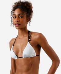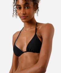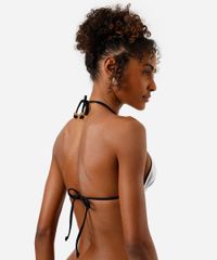 Biquíni top feminino confeccionado em malha com proteção UV. A peça é dupla face é tem modelagem cortininha, com caimento ajustado ao corpo, tira fina na base ajustável e alças de amarração. Não possui bojos.