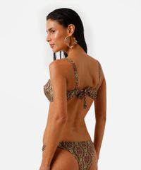 Biquíni top feminino confeccionado em malha de poliamida com proteção UV e estampa abstrata. A peça tem modelagem meia taça, com caimento ajustado ao corpo, bojos, aros e alças finas. Possui forro em malha e fechamento por amarração.