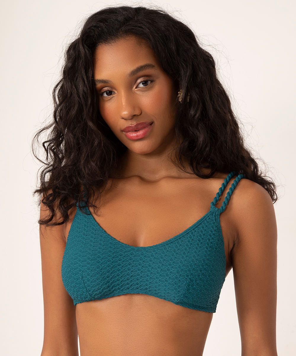 Top confeccionado em malha de poliamida com proteção UV50+ texturizada. A peça modelo regata possui decote redondo, bojo removível e alças duplas com efeito torcido. Forro, acabamento elástico e fechamento posterior por amarração.