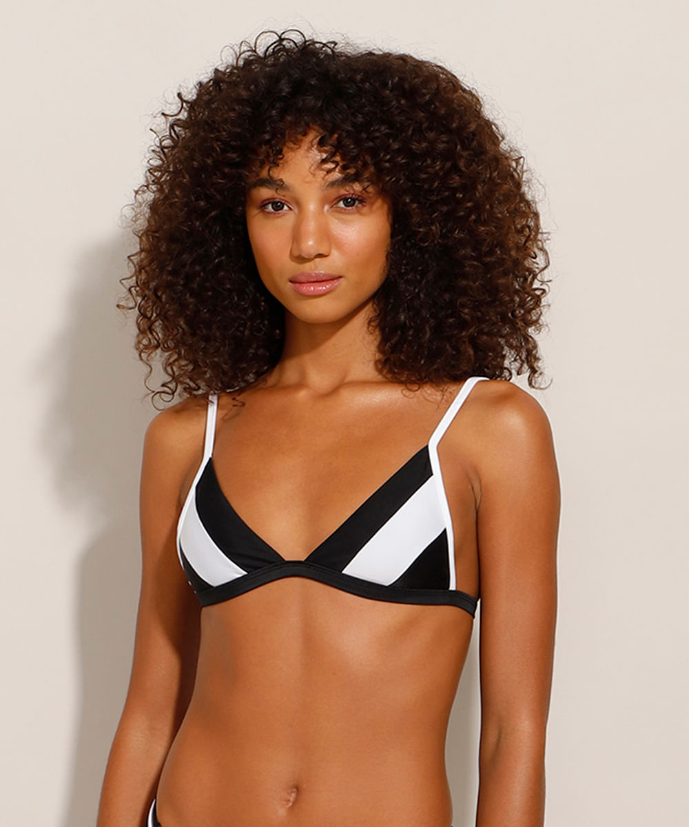 Biquíni top feminino confeccionado em malha com proteção UV50+. O modelo é triângulo com recortes frontais, forro e bojo removível. As alças são finas com reguladores. O fechamento é posterior por amarração.
