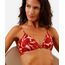 Biquíni top feminino confeccionado em malha de poliamida com proteção UV e estampa floral. O modelo é triângulo com caimento ajustado ao corpo, alças finas ajustáveis e fechamento posterior por amarração.
