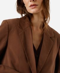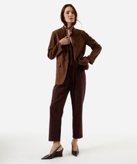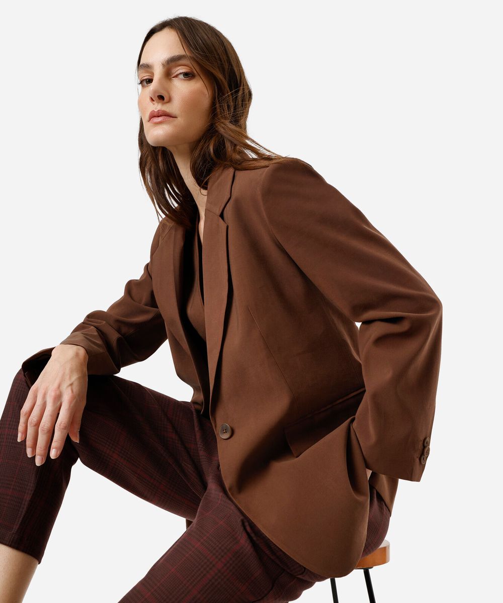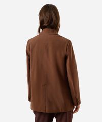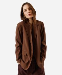 Blazer de alfaiataria feminino confeccionado em tecido plano com viscose. A peça tem a modelagem e construção reta e o caimento é confortavelmente solto ao corpo. O modelo tem lapela clássica, fechamento por botão e mangas longas com botões nos punhos. Possui dois bolsos, forro em tecido plano e fenda posterior.