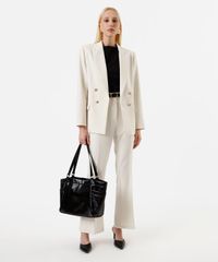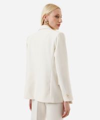 • Modelagem de alfaiataria com estrutura reta, ombros marcados e lapela clássica.