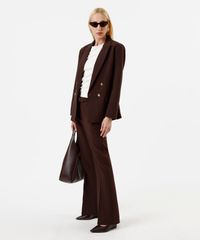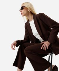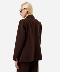 • Modelagem de alfaiataria com estrutura reta, ombros marcados e lapela clássica.