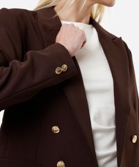 • Fechamento frontal transpassado com duplo abotoamento e botões dourados que adicionam um toque de sofisticação.