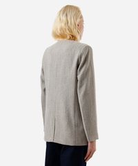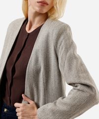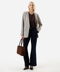 Blazer de alfaiataria feminino confeccionado em tecido com viscose e padronagem espinha de peixe. A peça tem a modelagem e construção reta e o caimento é confortavelmente solto ao corpo. O modelo tem decote V, fechamento frontal por botão, ombros estruturados e mangas longas. Possui forro em tecido plano, dois bolsos com lapela e fenda posterior.