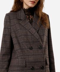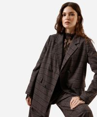 Blazer de alfaiataria feminino confeccionado em tecido plano com padronagem xadrez. A peça tem a modelagem oversized, com construção reta e o caimento é confortavelmente solto ao corpo. O modelo tem lapela clássica, fechamento por duplo abotoamento e mangas longas. Possui forro.