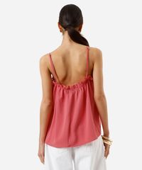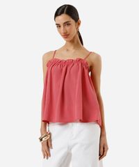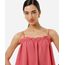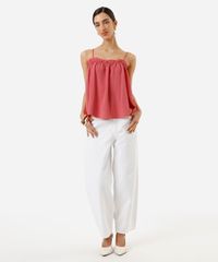 Blusa feminina confeccionada em tecido plano com viscose. A peça tem a modelagem reta e caimento solto ao corpo. O modelo tem decote quadrado, com abado aplicado em todo o contorno e alças finas ajustáveis. Detalhe de acabamento pespontado na barra.