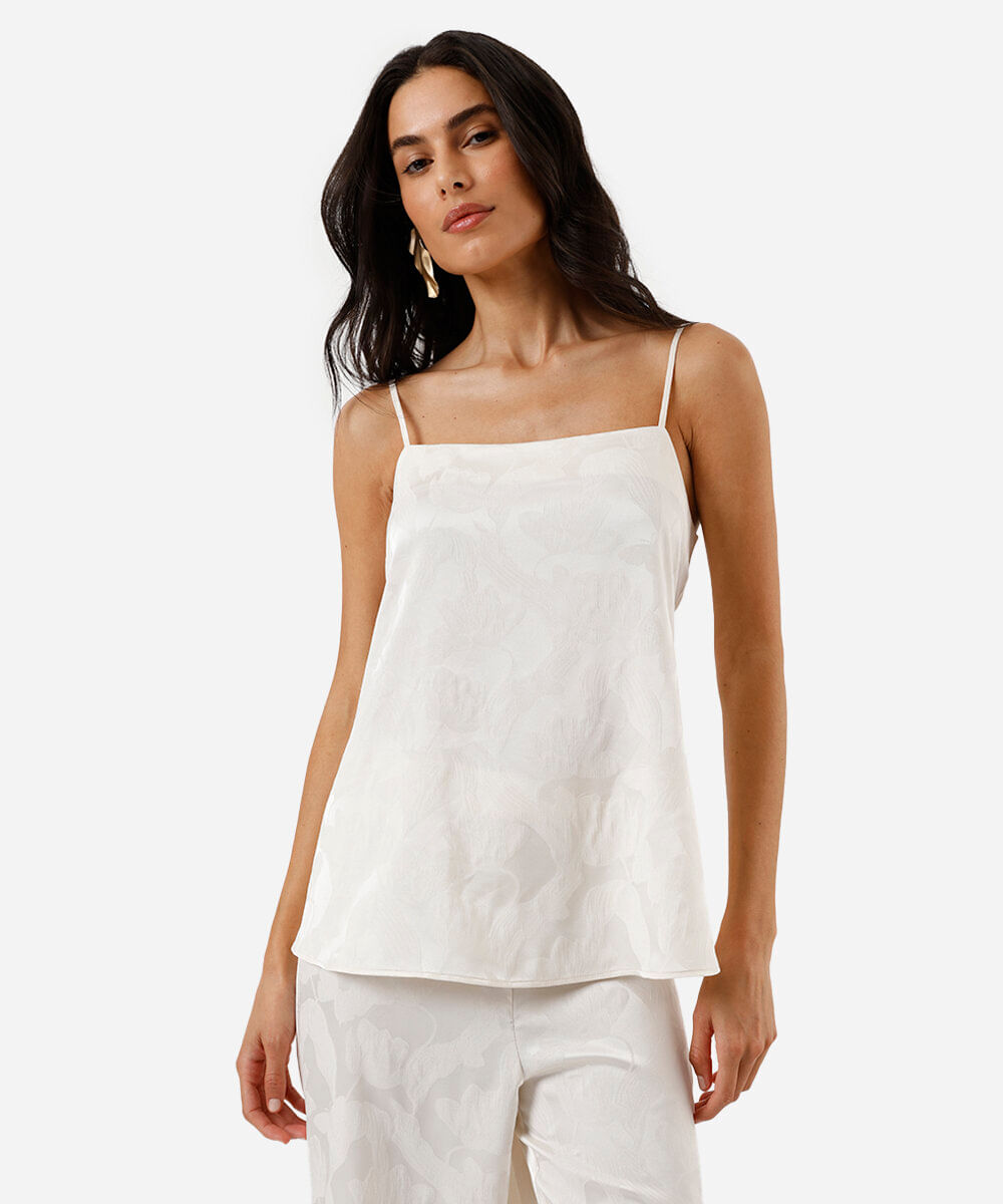blusa alça fina feminina de jacquard floral acetinada off white