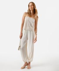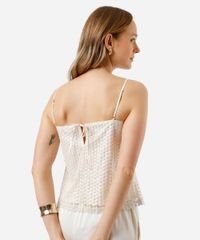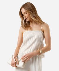 Blusa feminina confeccionada em tecido bordado com paetês. A peça tem a modelagem e construção reta e o caimento é confortavelmente solto ao corpo. O modelo tem decote quadrado, fechamento por amarração posterior e alças finas ajustáveis. Possui forro e acabamento com pesponto na barra.