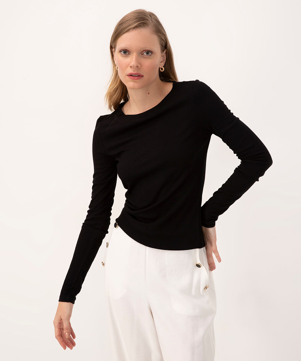 Blusa confeccionada em malha canelada de viscose. Modelo com comprimento alongado e caimento ajustado, possui decote canoa e mangas longas, barra é pespontada.