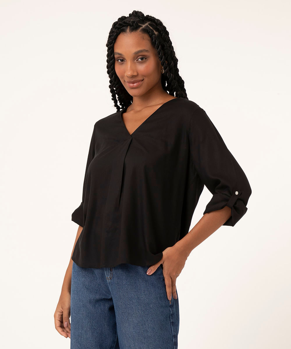 Blusa confeccionada em tecido plano de viscose. A modelagem é ampla com barra arredondada, decote em V e prega frontal. As mangas são longas com martingale para ajuste.
