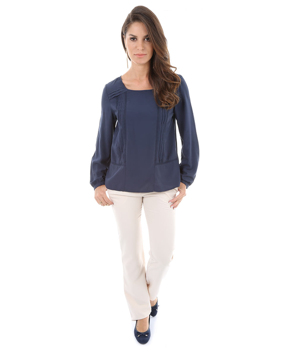 Essa blusa tem o caimento soltinho perfeito para suas combinações! O modelo é confeccionado em tecido com toque macio. Tem decote redondo, manga longa de punho com fechamento por botão. O seu diferencial fica por conta das nervuras e renda na parte frontal da peça. Essencial para você! Experimente usar com calça flare e sapatilha que irá arrasar!