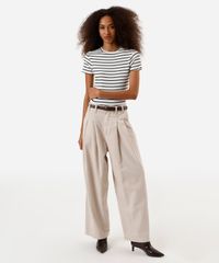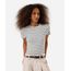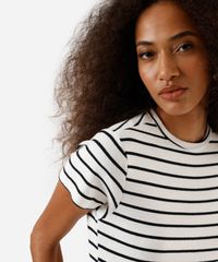 Blusa feminina confeccionada em malha canelada com algodão e padronagem listrada. A peça tem a modelagem baby look, com construção reta e o caimento é levemente ajustado ao corpo. O modelo tem decote redondo e mangas curtas. Possui acabamento pespontado nos punhos e na barra.
