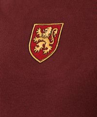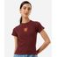 Blusa feminina confeccionada em malha canelada de algodão com patch bordado com brasão da casa Grifnória de Harry Potter na parte frontal. A peça tem a modelagem baby look, com construção reta e o caimento é ajustado ao corpo. O modelo tem gola redonda e as mangas são curtas com acabamento pespontado nos punhos e na barra.