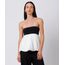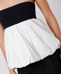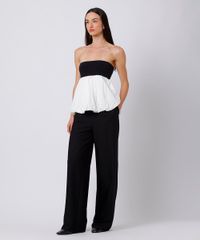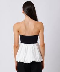 Blusa feminina confeccionada em malha macia de algodão. A peça tem a modelagem e construção balonê, com caimento ajustado na parte superior e volumoso na parte inferior. O modelo tem decote reto com elástico embutido, sem alças e com acabamento forrado.