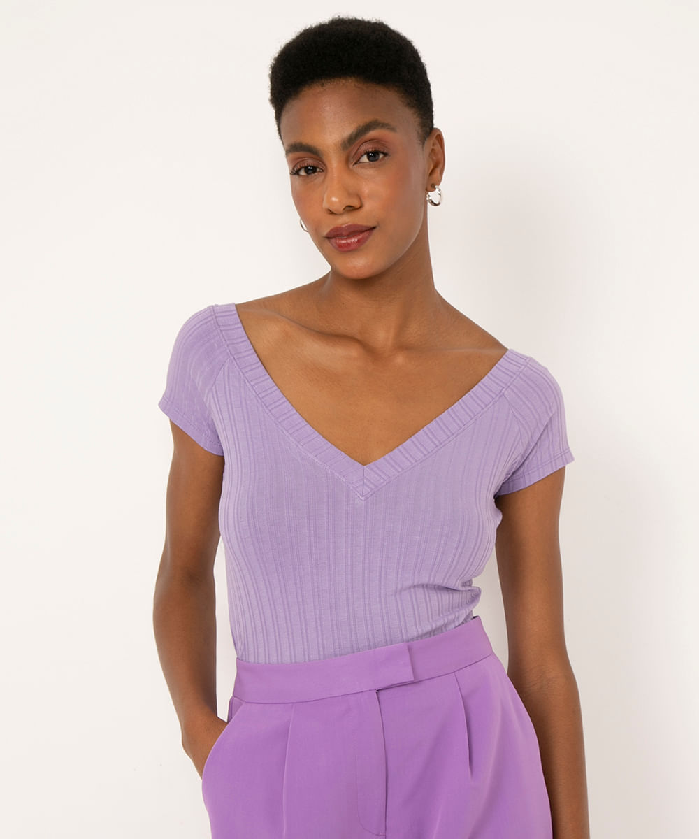 Blusa feminina confeccionada em malha canelada. A modelagem é ajustada com manga curta e decote V.