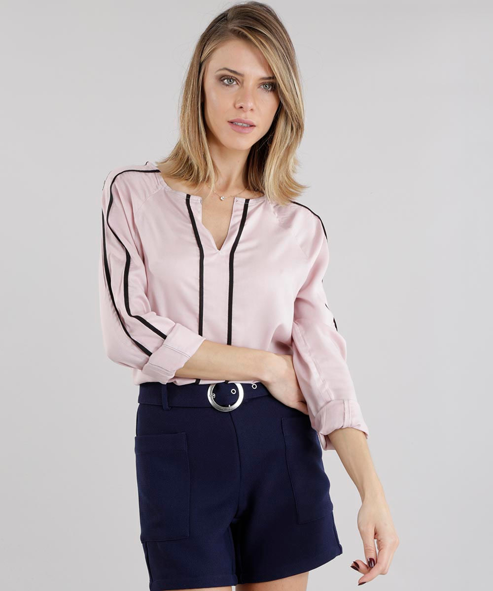 Blusa desenvolvida e tecido plano. O charme da peça são os recortes com vivo contrastante. O decote é redondo com recorte e as mangas longas.