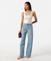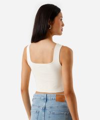 Blusa corset feminina confeccionada em tricot leve. A peça tem modelagem reta e caimento ajustado ao corpo com recortes que modelam a silhueta. O modelo tem decote quadrado e alças largas.