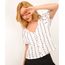 Blusa feminina confeccionada em malha de laise com toque leve. A peça possui modelagem reta com caimento levemente solto, decote V, mangas curtas bufantes com elástico embutido nas barras, detalhe de pregas nos ombros, fechamento frontal por botão com efeito holográfico, padronagem listrada e florzinhas vazadas, acabamento pespontado.