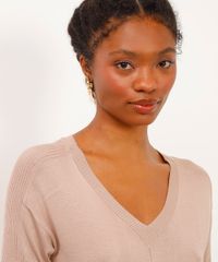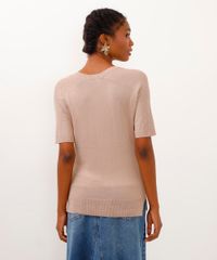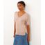 Blusa confeccionada em tricot . A peça tem caimento ajustado, padronagem com recortes em canelado, decote V, mangas curtas, fenda laterais e acabamento em canelado.