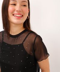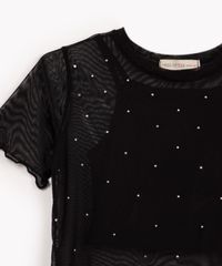 • Tecido de tule com aplicações de brilho (strass) por toda a peça.