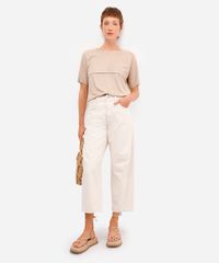 Blusa confeccionada em suede. A modelagem é reta com caimento solto, as mangas são curtas e o decote é redondo. Possui recortes frontais com pesponto contrastante, além de acabamento a fio nas mangas e barra.