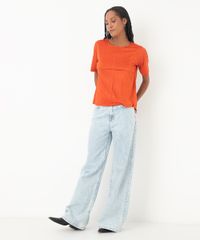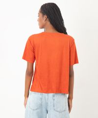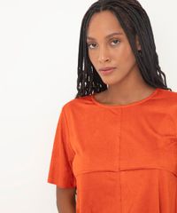 Blusa confeccionada em suede. A modelagem é reta com caimento solto, as mangas são curtas e o decote é redondo. Possui recortes frontais com pesponto contrastante, além de acabamento a fio nas mangas e barra.