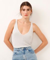 Blusa confeccionada em tricot com brilho. Decote em V, alças médias e possui barra com acabamento simples.