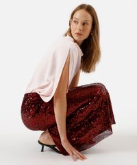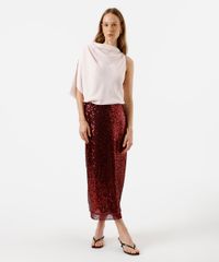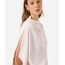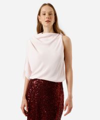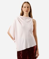 Blusa feminina confeccionada em tecido plano com toque acetinado. A peça tem a modelagem assimétrica, com construção reta e o caimento é amplo e confortavelmente solto ao corpo. O modelo tem decote redondo, pregas no ombro e fenda lateral. Detalhe de acabamento pespontado na barra.