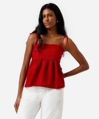 Blusa feminina confeccionada em tecido sintético com toque levemente texturizado . Possui modelagem peplum, caimento levemente solto, decote reto, alças finas com amarração, busto com recorte levemente ajustado, detalhes com bordados sutis no tecido.