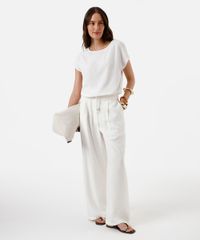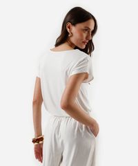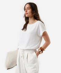 Blusa feminina confeccionada em malha de viscose e tecido plano texturizado na parte frontal. A peça tem a modelagem reta e o caimento é confortavelmente solto ao corpo. O modelo tem decote redondo e mangas curtas com tira fina embutida na barra para amarração.