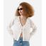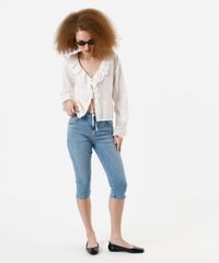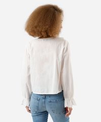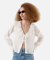 Blusa feminina confeccionada em tecido leve de algodão. A peça possui decote v com babado aplicado em laise, mangas longas com punhos em laise, leve transparência, caimento reto e solto ao corpo, acabamento pespontado e tiras aplicadas para amarração. Composição: 100% algodão Modelo veste: P Medidas da modelo - Altura: 1,73m Busto: 86cm Cintura: 70cm Quadril: 101cm. Instruções de lavagem: - Lavar à mão - Proibido o alvejamento - Não secar em tambor - Secagem em varal - Passar à temperatura média - Não limpar à úmido