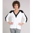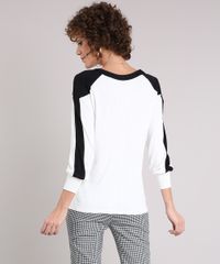 Blusa feminina desenvolvida em malha de viscose. Possui recortes contrastantes na parte frontal, posterior e mangas. A modelagem é reta com caimento soltinho. O decote é em V e as mangas são longas com punho ajustado, formando um leve franzido. O acabamento é simples.