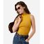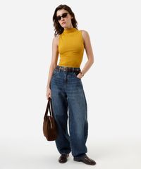 Blusa feminina confeccionada em malha canelada de algodão. A peça tem corte reto e o caimento é ajustado ao corpo. O modelo tem gola alta e alças largas. Possui acabamento pespontado nas cavas e na barra.