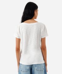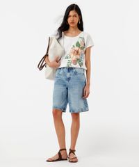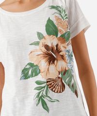 Blusa feminina confeccionada em malha de algodão com estampa localizada floral na parte frontal. A peça tem a modelagem reta e o caimento é confortavelmente solto ao corpo. O modelo tem decote redondo em tecido com textura canelada e as mangas são curtas com recortes e acabamento pespontado nos punhos e na barra.