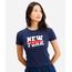 Blusa feminina confeccionada em malha macia de algodão com bordado escrito "New York" com textura aveludada na parte frontal. A peça tem modelagem reta e caimento levemente solto ao corpo. O modelo tem decote redondo e mangas curtas. Detalhe de acabamento pespontado no decote e punhos das mangas.