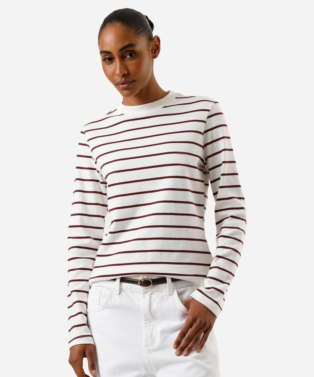 Blusa feminina confeccionada em malha de algodão peruano com estampa listrada. A peça tem a modelagem reta e o caimento é confortavelmente solto ao corpo. O modelo tem gola redonda em tecido com textura canelada e as mangas são longas com acabamento pespontado nos punhos e na barra.