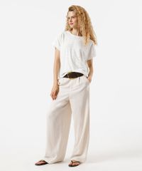 Blusa feminina confeccionada em malha laise com bordados vazados. A peça tem a modelagem reta e o caimento é amplo confortavelmente solto ao corpo. O modelo tem decote redondo em tecido com textura canelada e as mangas são curtas com acabamento pespontado na barra.